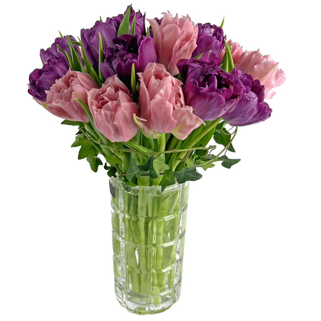 Tulips in Motion showcases the rare beauty of double tulips, a unique variety prized for their lush, peony-like blooms and layered petals. Unlike traditional tulips, double tulips open wide and full, creating a soft, ruffled appearance that adds depth, movement, and luxurious texture to the arrangement.