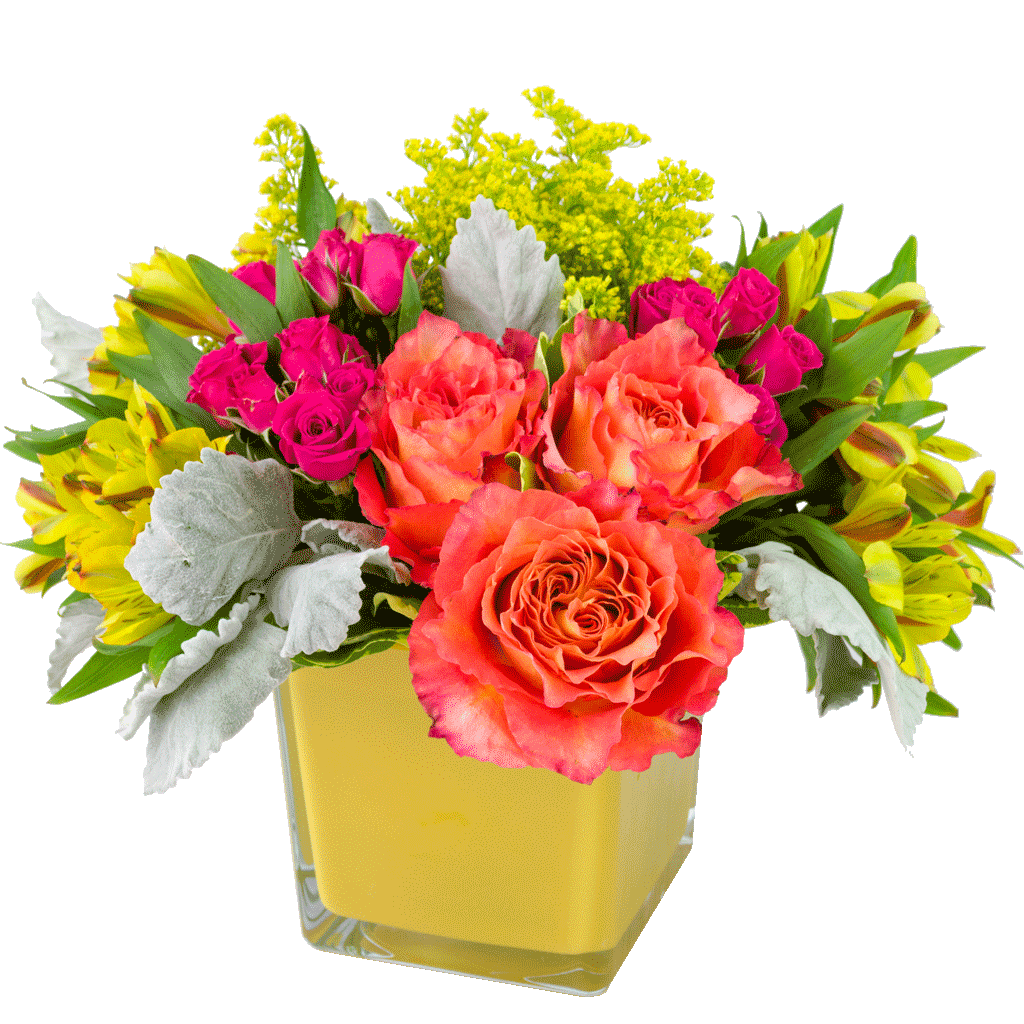 Enchant them with vibrant colors and beautiful flowers. The Vibrant Vision Bouquet features a mixture of premium roses, alstroemeria and solidago for an incredible pop of color beautifully designed in a colorful, high-quality glass vase made in Poland. Polish glass has the reputation of being some of the finest in the world.