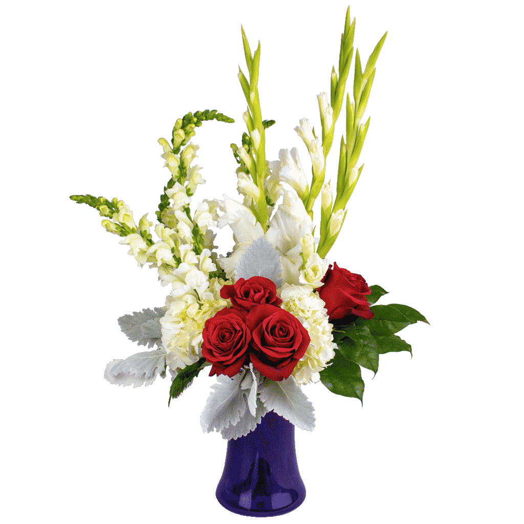White gladiolus, red roses and dusty miller in a blue vase makes up this a striking, patriotic flower arrangement.