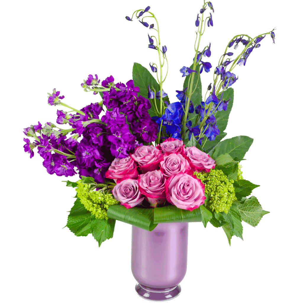 Arranged in a striking purple Polish glass vase, this bouquet exudes a sense of regal beauty and grace. Perfect for any occasion, this enchanting arrangement will bring a touch of luxury and splendor to any space, radiating charm and refinement.