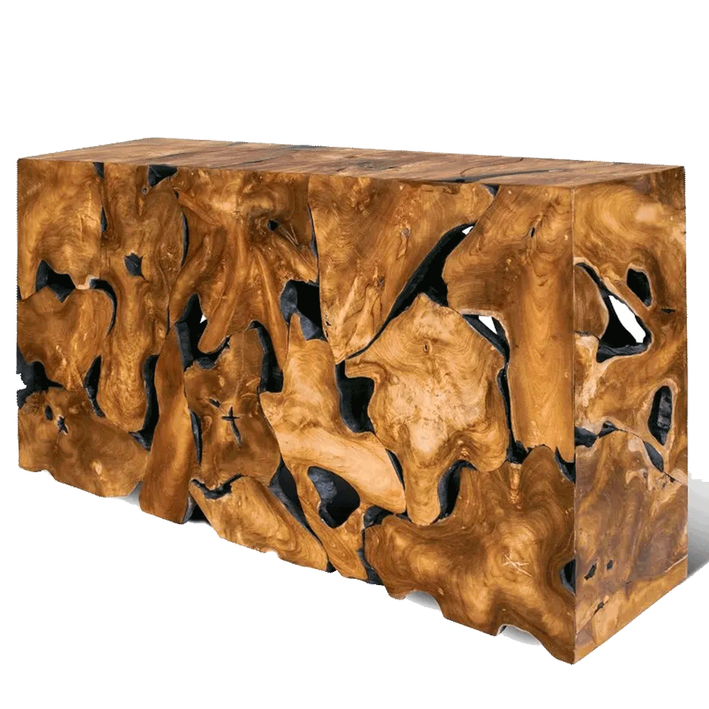 The Teak Wood Console Table is a stunning blend of natural beauty and contemporary design. Crafted from solid teak wood blocks with raw, organic edges, this console table showcases the rich golden-brown hues and unique grain of each piece, making every table one-of-a-kind. With its sturdy construction, it brings timeless elegance and eye-catching character to your entryway, living room, or hallway.