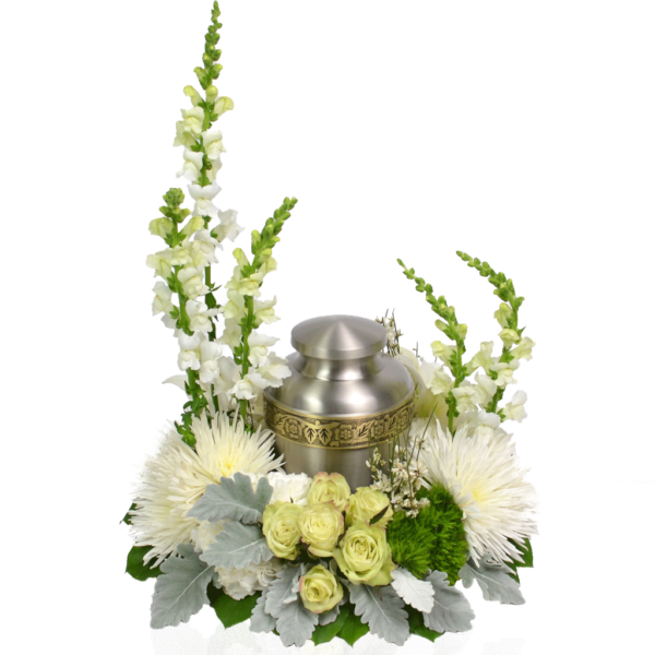A heavenly soft design consisting of white roses and snapdragons with green accents for an elegant look to surround your urn at your loved one’s memorial.