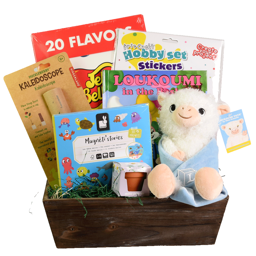 Inspired by Loukoumi, the lovable lamb from the beloved children’s book series, this gift basket encourages kindness, creativity, and imagination. Loukoumi’s stories are known for teaching children the importance of good deeds, compassion, and making a positive impact in the world.
