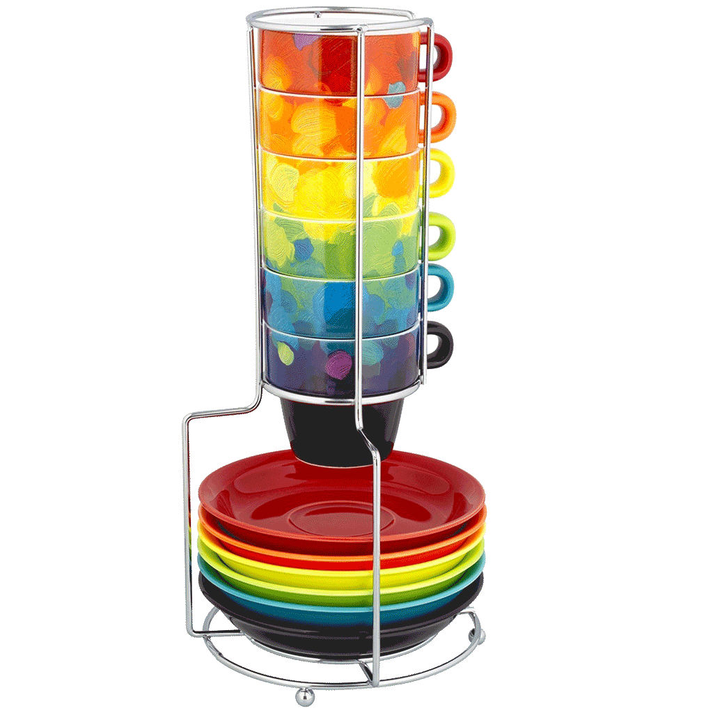 A true masterpiece of beauty and utility! The Pylones Espresso Cups & Saucer Stack are 6 cups and 6 saucers, each having their own personalized touch. The Pylones Espresso Cups & Saucer Stack makes an excellent gift for any occasion: weddings, graduations, back-to-school, housewarmings, birthdays, Christmas, or even as a special treat for yourself.