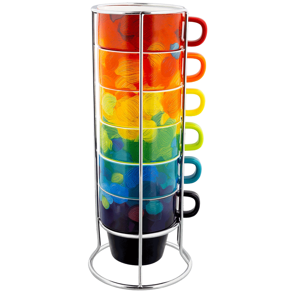 A true masterpiece of beauty and utility! The Pylones Cappuccino Cups Stack are 6 cups, each having their own personalized touch. These mugs make an excellent gift for any occasion: weddings, graduations, back-to-school, housewarmings, birthdays, Christmas, or even as a special treat for yourself.