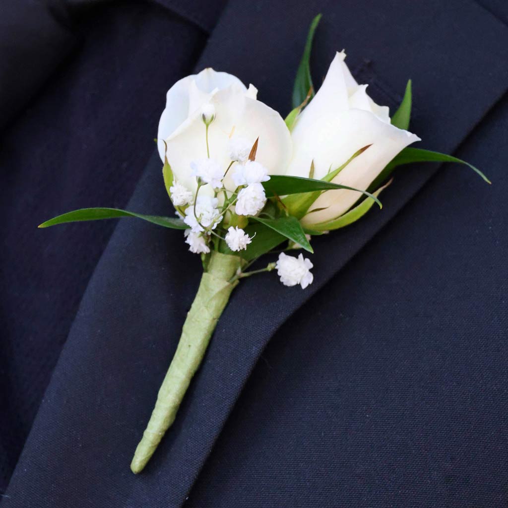 The White Sweetheart Boutonniere features 2 delicate white sweetheart roses, complemented by subtle greenery for a soft, refined look.
