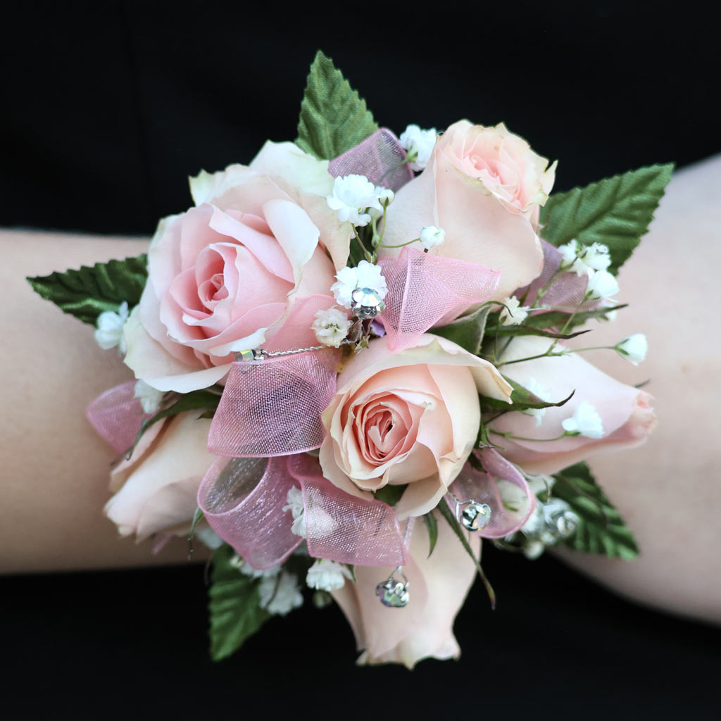 Soft pink roses and delicate baby’s breath accented with bling create a timeless harmony.