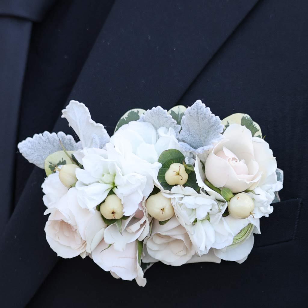A sleek and elegant accessory, the Pure Radiance Pocket Square features white roses, stock, and hypericum berries, effortlessly sliding into the pocket without the need for pins.